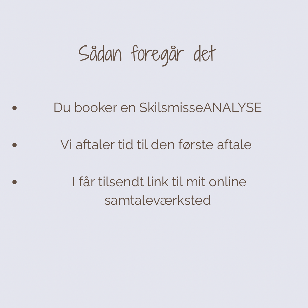 Det hele starter med en gratis og uforpligtende skilsmisseANALYSE, hvor du fortæller mig om jeres situation og jeg deler de 2-3 ting, der vil kunne ændre jeres uenigheder, så I ikke ender i en fastlåst konflikt.